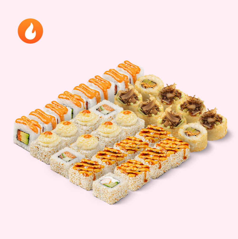 Щедрая госпожа знает, как ты любишь рыбку: бери сет с лососем. Состав: Румяный лосось, Уромаки с лососем и авокадо, Жареный лосось чиз, Том ям