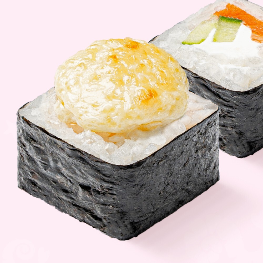 Рис, мицукан ,сахар, комбу, соль, нори, лосось, сыр сливочный, огурец, сыр гауда, майонез