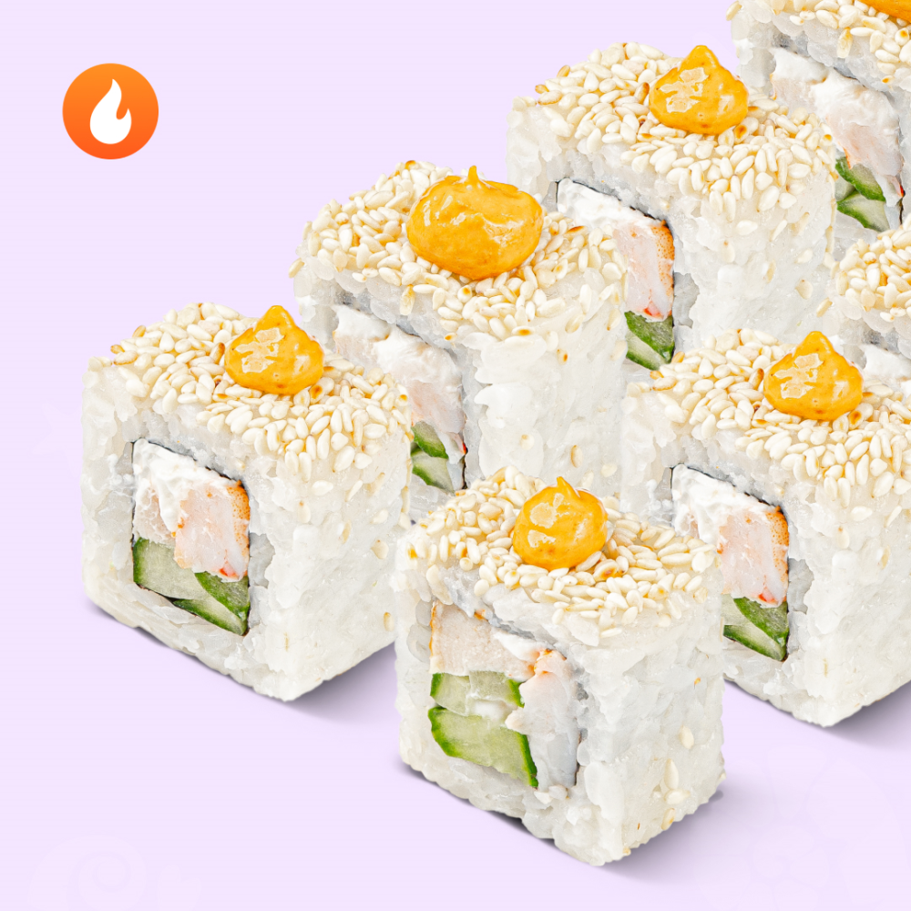 Ролл с креветкой и курицей под пикантным соусом том ям. Состав: нори, рис отварной, сыр сливочный, огурец, креветка, курица жареная, кунжут, соус том ям