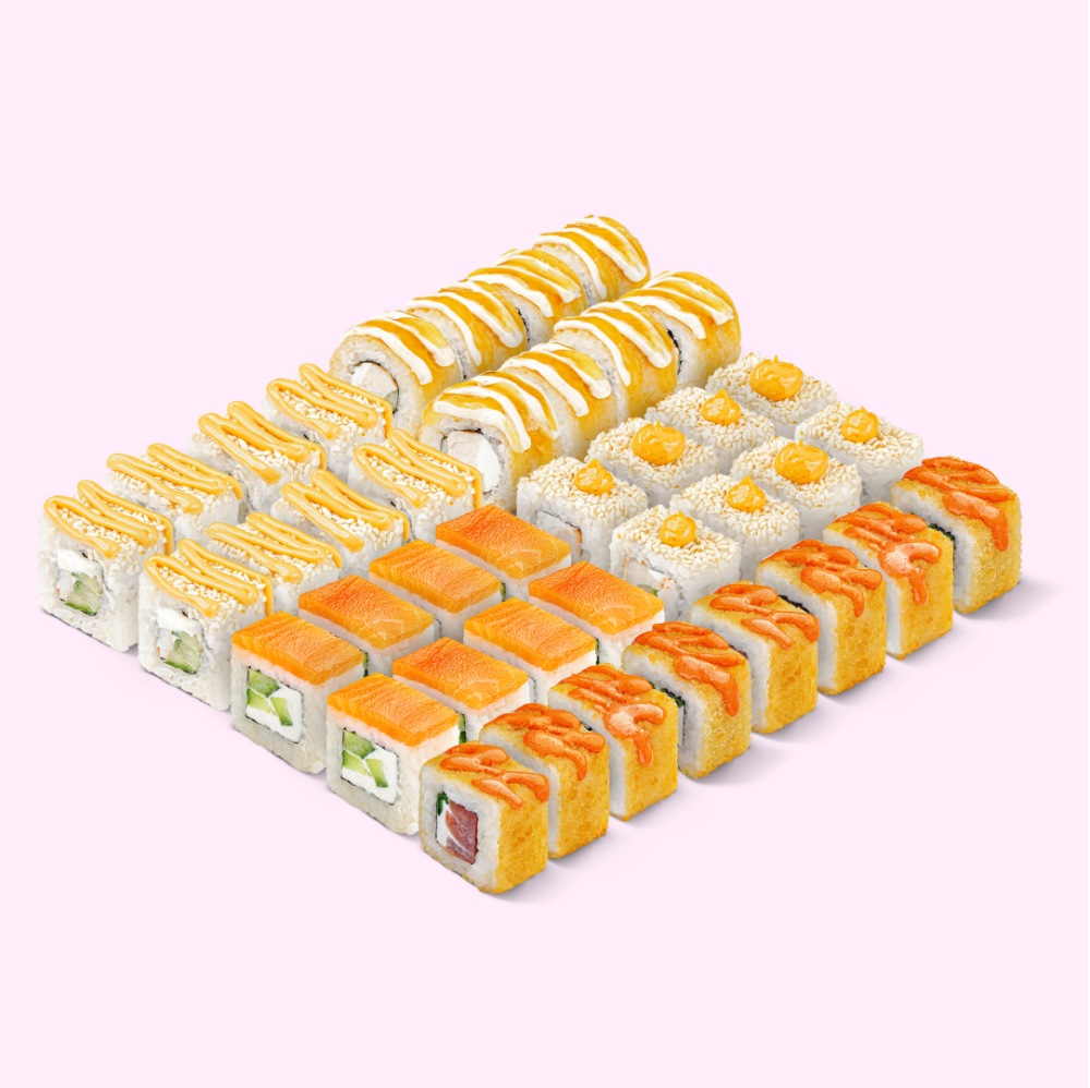 Собрали самое вкусное в один набор: лосось, курочка и креветка. Вкус дополняют экзотические соусы. Состав: Филадельфия лайт, Спейшл NEW, Курица чили-ананас, Креветка 1000 островов, Том ям с креветкой