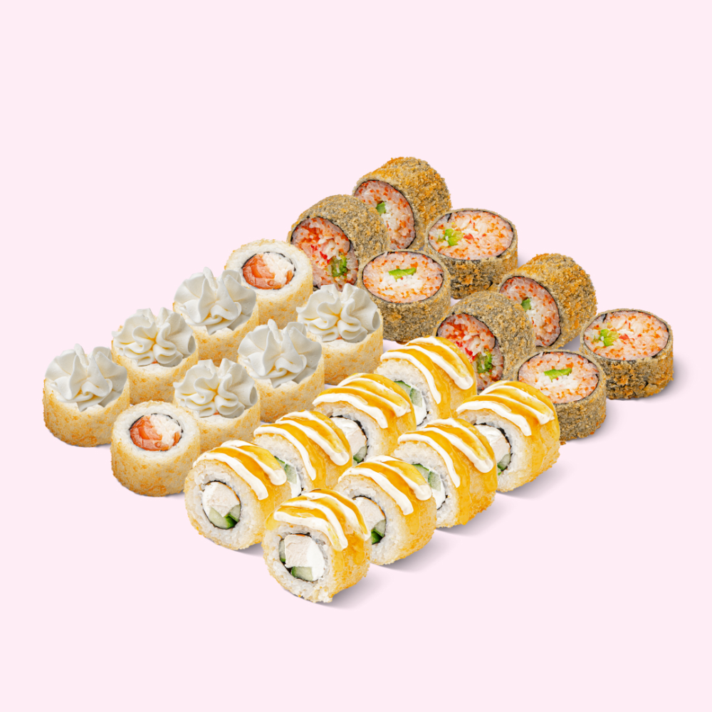 Горячий сет с крабом, лососем, курицей на двоих. Состав: Калифорния темпура, Филадельфия темпура, Курица чили-ананас