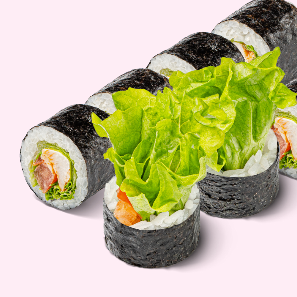 Сочное куриное филе, укутанное нори и обильно политое сладковатым соусом том ям. Состав: курица жареная, нори, помидор, рис, салат, соус том ям