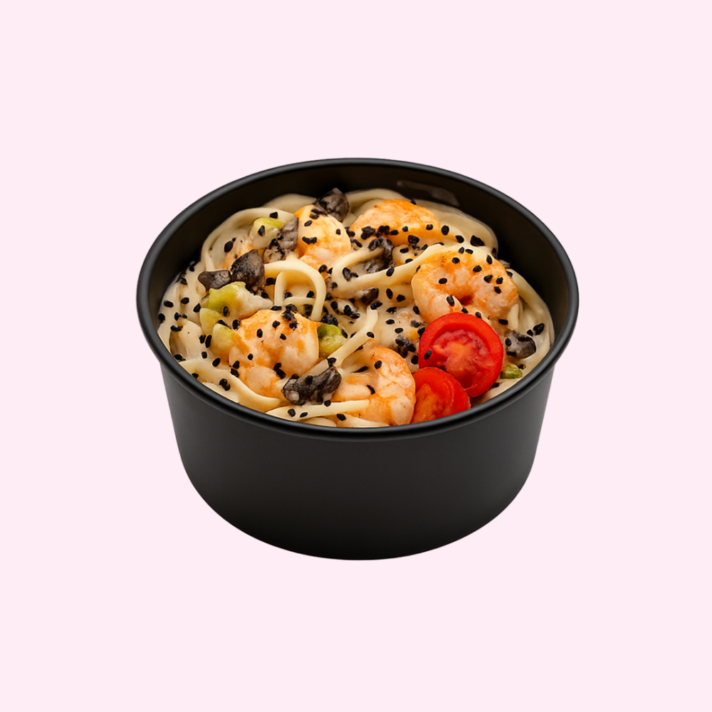 Лапша удон, креветки, лук зелёный, шампиньон, перец болгарский, соевый соус, соус свит-чили+том ям, кунжут ч/б, помидоры черри