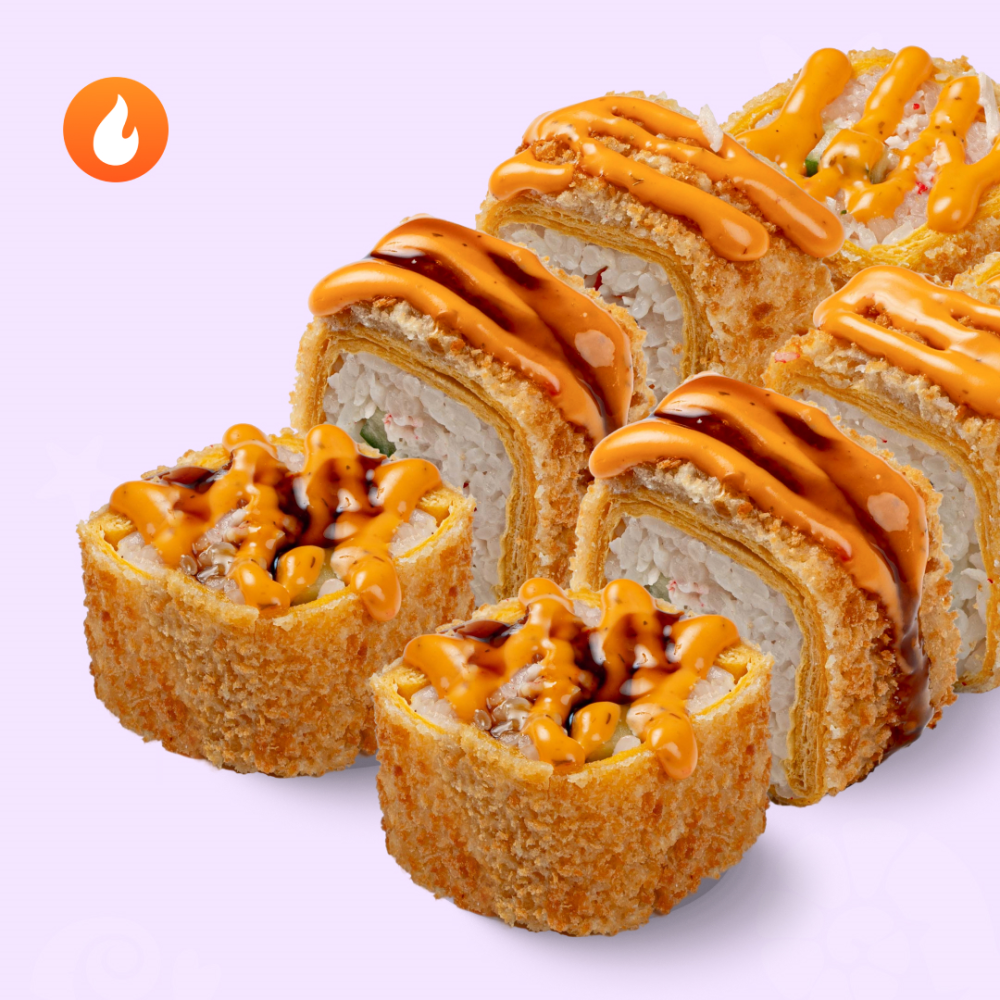 Пылкий краб, хрустящий лук и два ярких соуса. Состав: тортилья,рис отварной, сыр сливочный, снежный краб с майонезом, огурец, кляр, сухари, соус унаги, соус 1000 островов