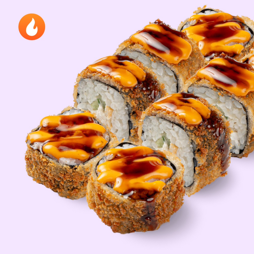 Нежную курочку укутали в нори и отжарили для тебя. Сочетание двух соусов делает вкус незабываемым. Состав: нори, рис отварной, курица сыр, огурец, кляр, сухари, соус 1000 островов, соус унаги