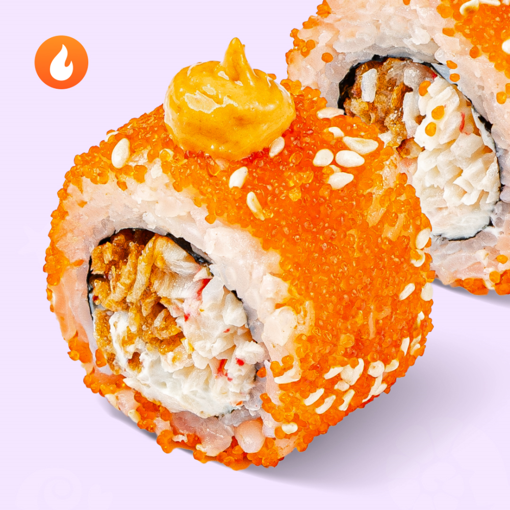 Не поскупились и добавили много краба и угря в начинку. Яркий вкус дополняют хрустящий лук и пряный соус том ям. Состав: снежный краб с майонезом, угорь, кунжут, лук кранч, нори, рис, соус том ям, сыр сливочный, тобико